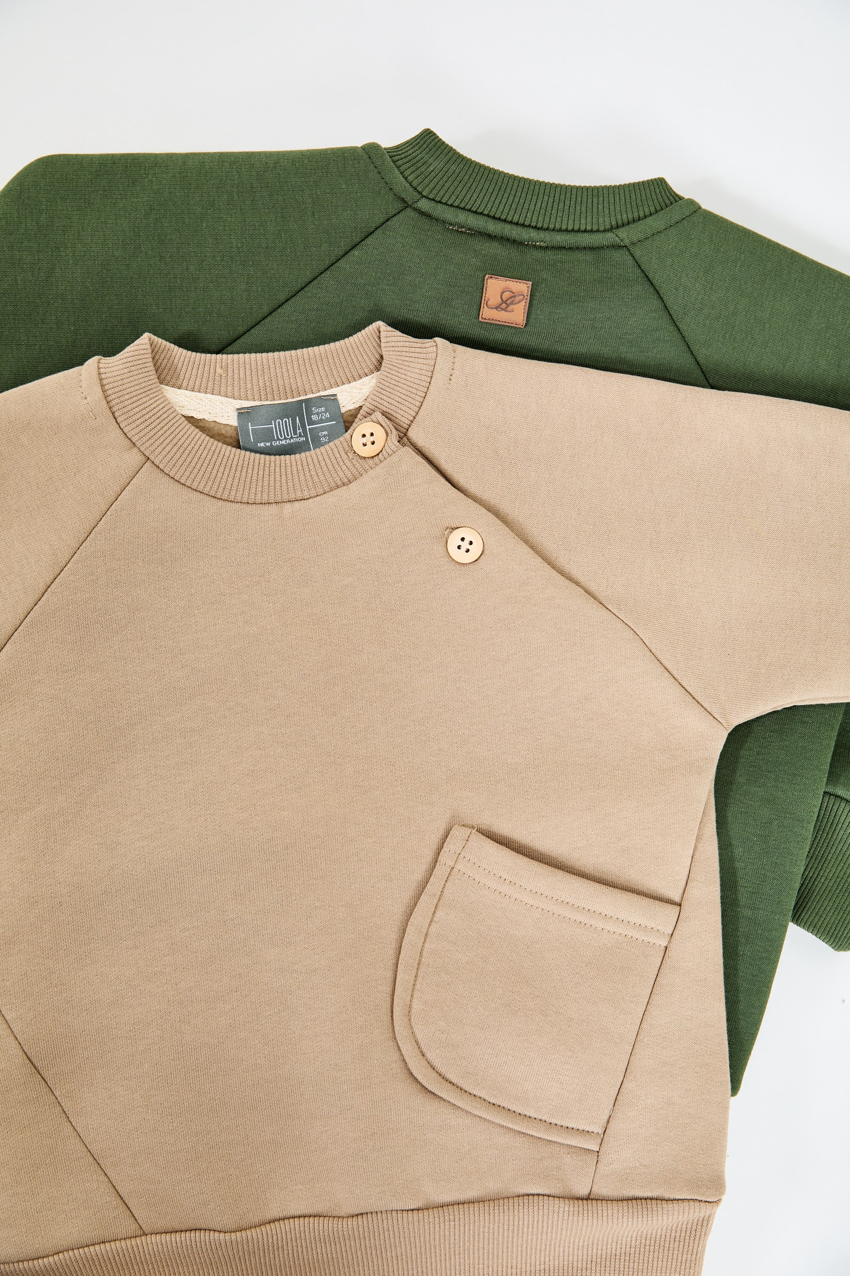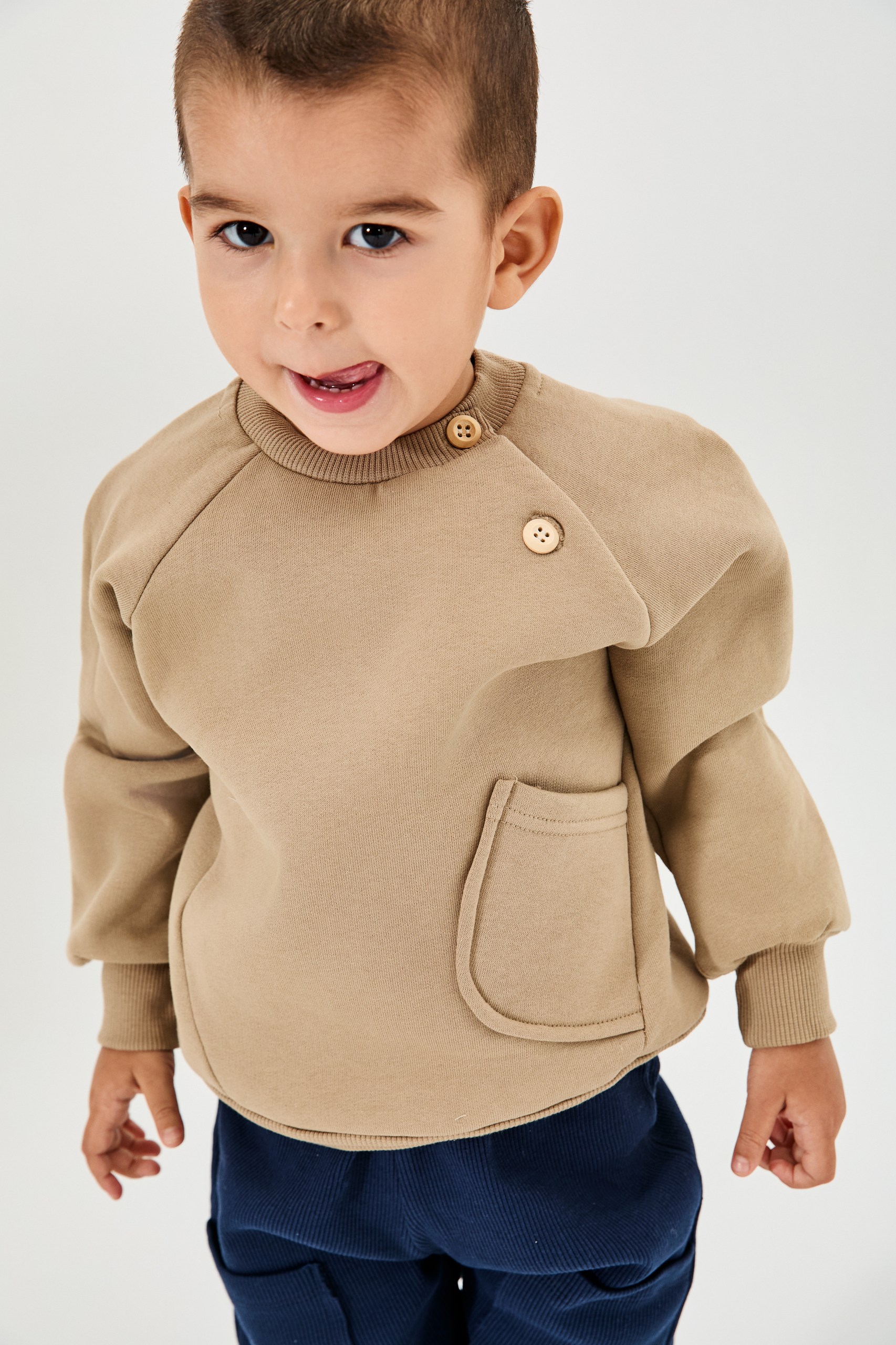 Bež pamučna dukserica za dečake uzrasta 6 meseci do 4 godine. Udobna, mekana i napravljena od 100% premium pamuka, sa dekorativnim drvenim dugmicima i praktičnim džepom.